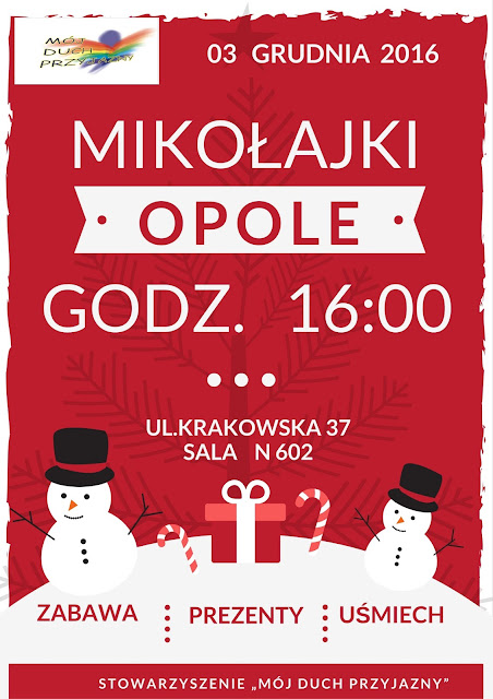 Szanowni państwo w dniu 3 grudnia Stowarzyszenie Mój Duch Przyjazny zaprasza na „Mikołajki”. Będzie to świetna okazja do spotkania się z nami, porozmawiania, spędzenia miło czasu wolnego. Mamy również do państwa prośbę, by każdy uczestnik spotkania przyszedł z własnoręcznie zrobionym prezentem np. wyhaftowaną serwetka, namalowanym przez państwa obrazkiem, wiersz, cokolwiek, co chcieliby państwo podarować drugiej osobie,
