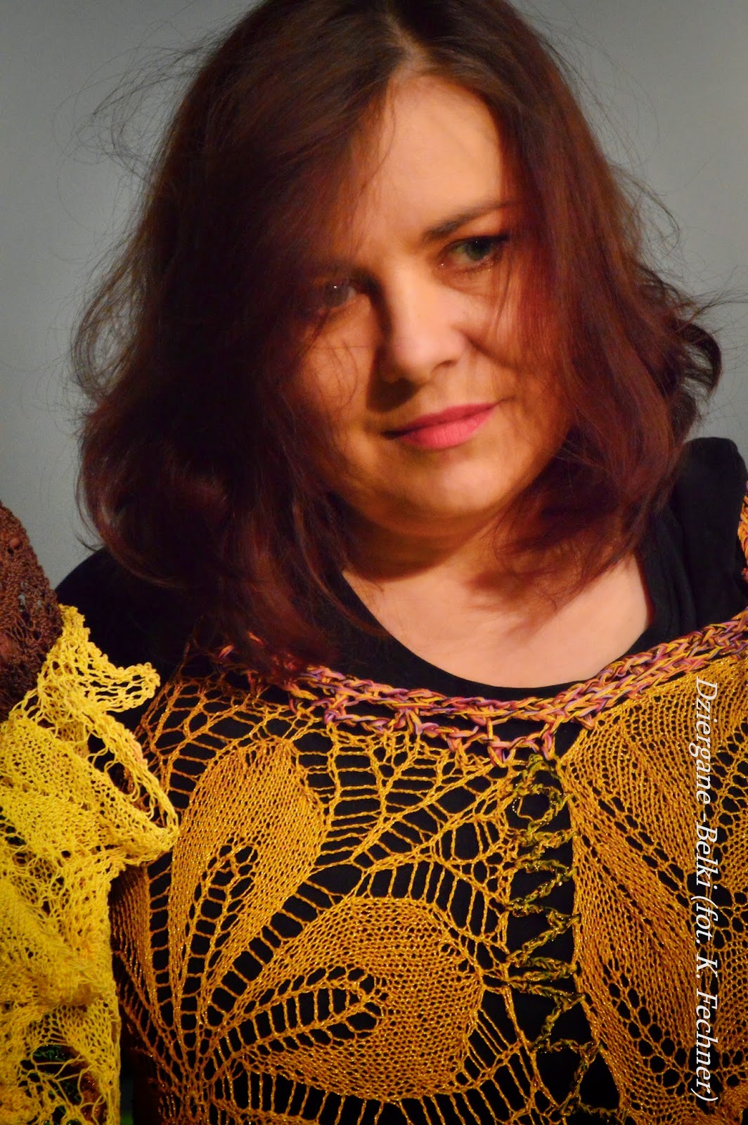 Elementy scenografii robione są z resztek materiałów i włóczek, jakie posiadałam w domu oraz podarowanych od sympatyków tego przedsięwzięcia. Od czasu do czasu odwiedzam oddział i z podziwem patrzę na tę cudowną pracę. Żałuję, że nie mogę w niej uczestniczyć, jednak z relacji Iwony dowiaduję się, że dla pacjentów to wielka przyjemność i radość. Powstała już siatka, powstała kolorowa tkanina, tworzy się siedzisko fotela. Będę miała lustro, ale jakie. Jesienią zrobiłam sweter na zamówienie. Okazał się nie właściwy dla osoby, która zażyczyła sobie swetra czarnego. Ponieważ okazał się za krótki i za szeroki, Kuratorki postanowiły wykorzystać moje fiasko robótkowe do naszego spektaklu.